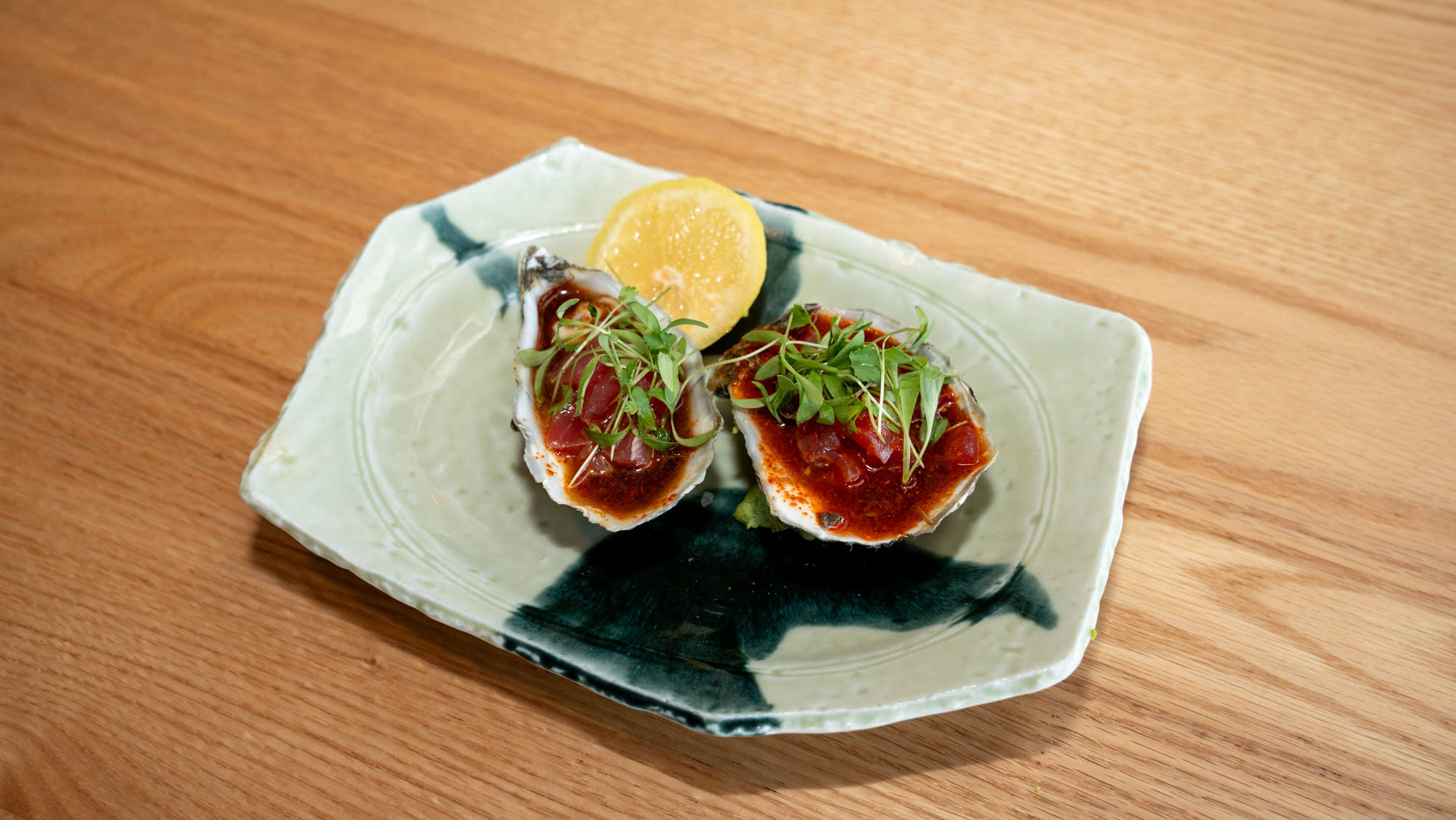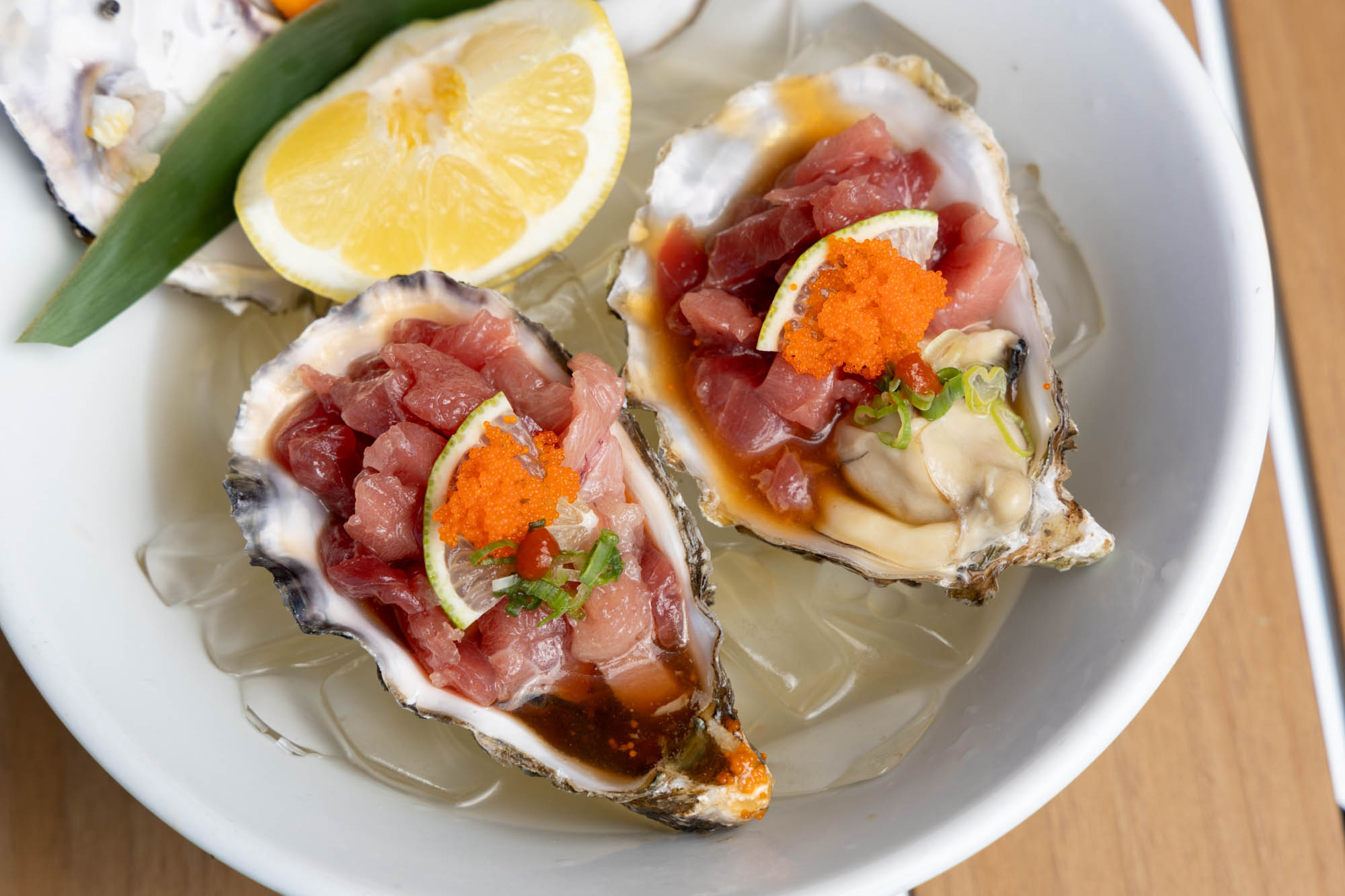 2 pc, ahi tuna, oyster, micro cilantro, lime, chili yuzu ponzu