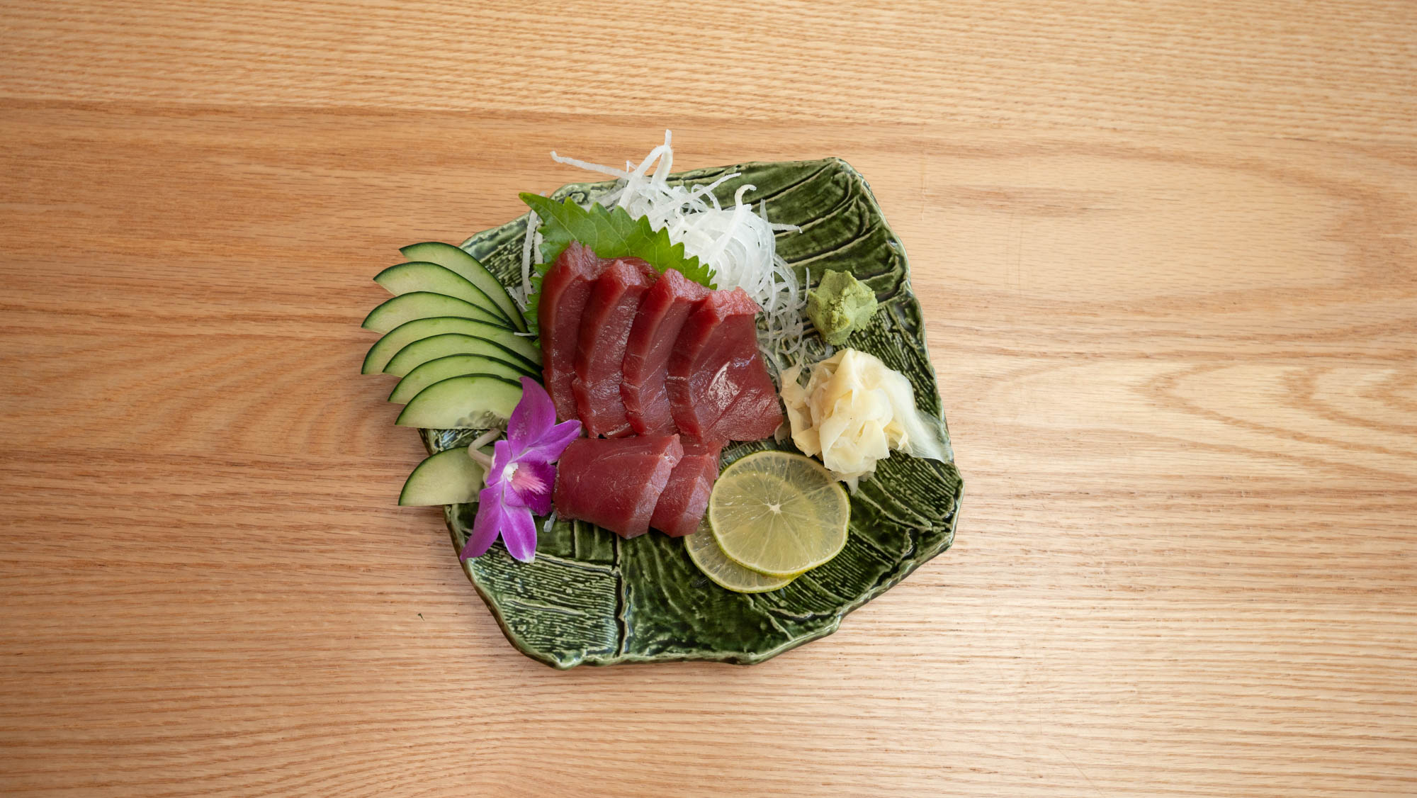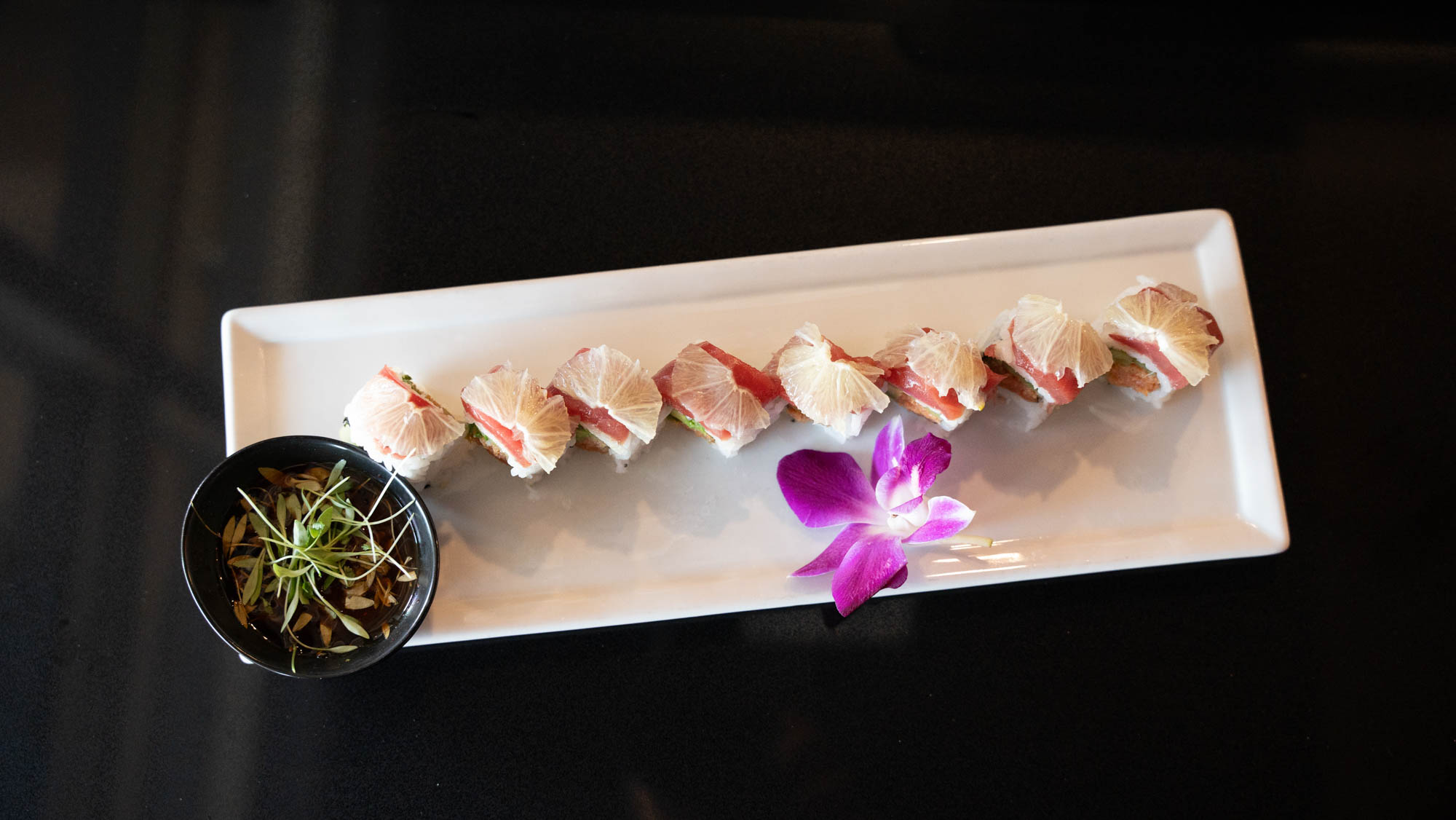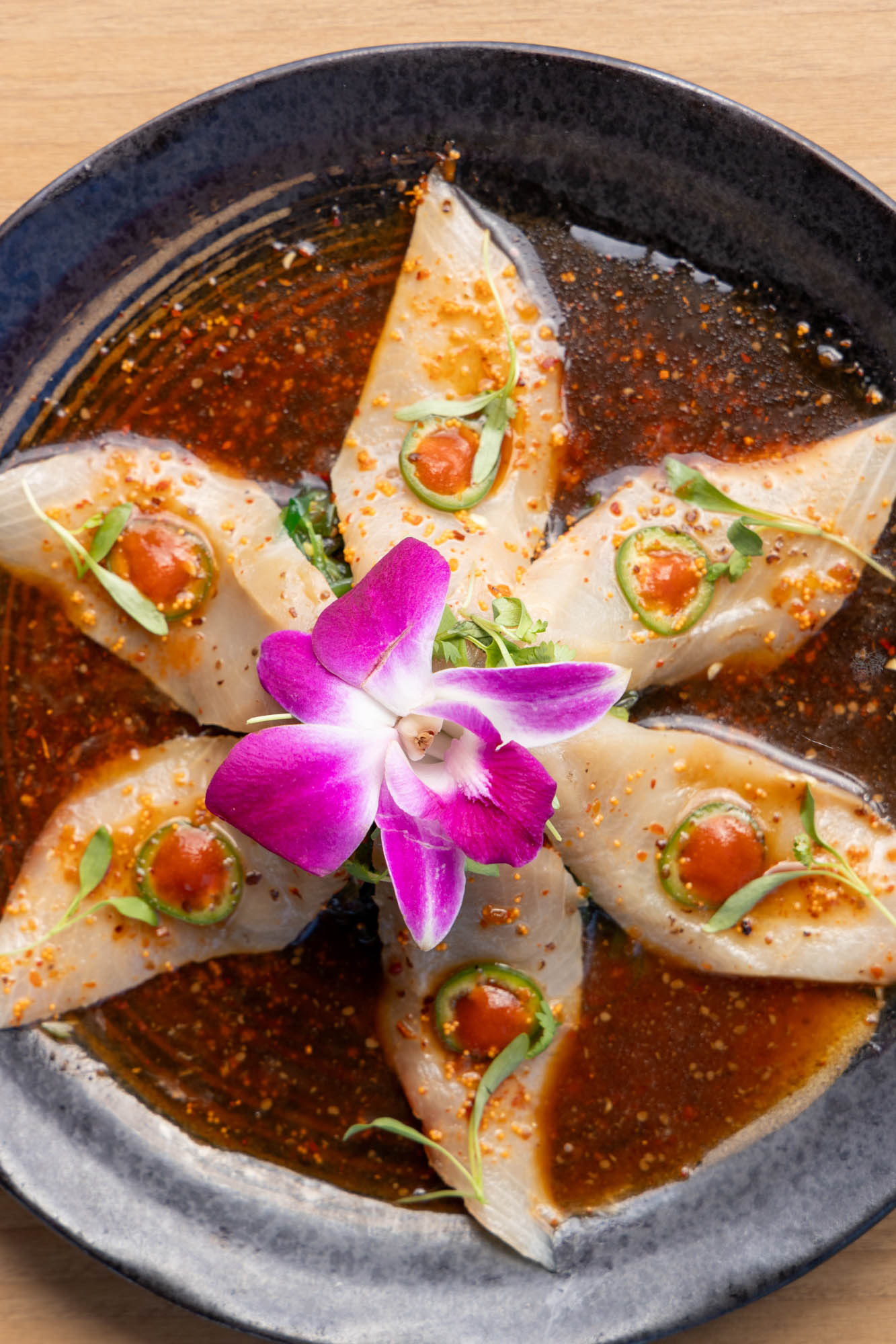 Yellowtail sashimi, yuzu ponzu, micro cilantro, serrano