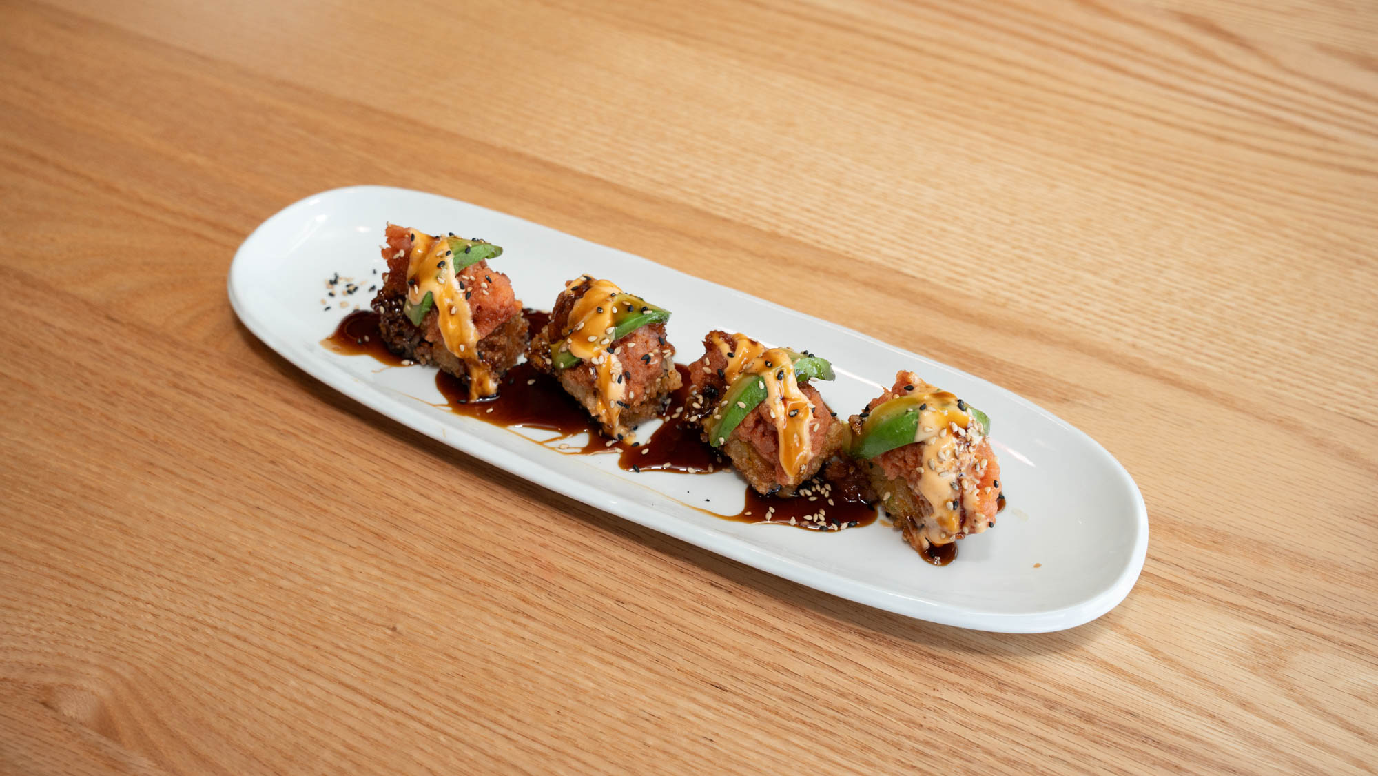 Ahi Tuna Oysters, Chicken Fried Rice, Fried Calamari, Fried Mixed Tempura, Takoyaki, Stuffed Jalapenos, Crab Puffs, Spicy Tuna Crispy Rice, Salt & Pepper Wings, Pork Steamed Bao Buns, Chicken Karaage, Tuna Pizza