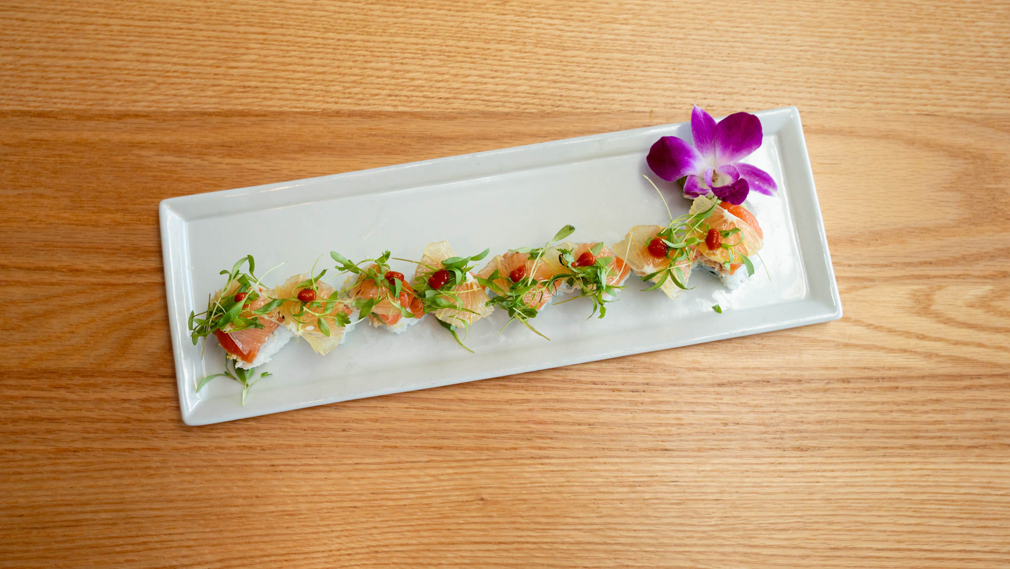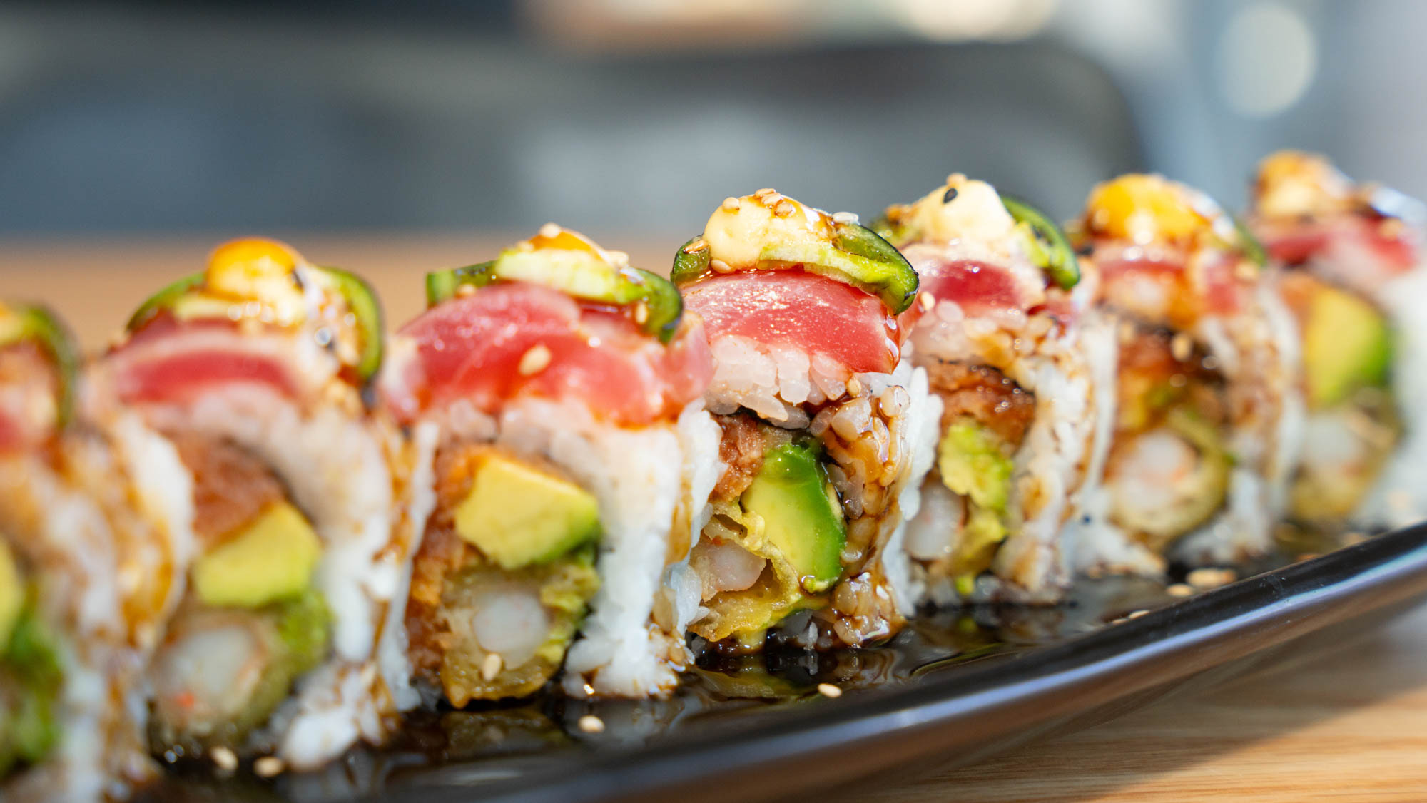 Truffle Salmon, Lemon Cilantro, Rockin’ Shrimp, Crispy Albacore, Baja Roll, Dynamite, Poway, Chili Mango, Brady Roll, Drop It Like Its Hot, Dragon, Surf & Turf, Firecracker, Flaming Ahi, Seared Cajun Tuna, Da Bomb, Tornado